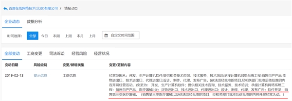 | 2月13日上午消息,企查查信息顯示,百度在線網(wǎng)絡(luò)技術(shù)(北京)有限公司工商信息發(fā)生變更,經(jīng)營范圍新增“銷售第三類醫(yī)療器械”、“銷售醫(yī)療器械II類”、“軟件開發(fā)”等內(nèi)容。 頁面顯示,百度在線網(wǎng)絡(luò)技術(shù)(北京)有限公司工商信息變更前經(jīng)營范圍包括:開發(fā)、生產(chǎn)計(jì)算機(jī)軟件;提供相關(guān)技術(shù)咨詢、技術(shù)服務(wù)、技術(shù)培訓(xùn);承接計(jì)算機(jī)網(wǎng)絡(luò)系統(tǒng)工程;銷售自產(chǎn)產(chǎn)品;貨物進(jìn)出口、技術(shù)進(jìn)出口、代理進(jìn)出口;設(shè)計(jì)、制作、代理、發(fā)布廣告。 變更后經(jīng)營范圍具體包括: 開發(fā)、生產(chǎn)計(jì)算機(jī)軟件;提供相關(guān)技術(shù)咨詢、技術(shù)服務(wù)、技術(shù)培訓(xùn);承接計(jì)算機(jī)網(wǎng)絡(luò)系統(tǒng)工程;銷售自產(chǎn)產(chǎn)品、醫(yī)療器械II類;貨物進(jìn)出口、技術(shù)進(jìn)出口、代理進(jìn)出口;設(shè)計(jì)、制作、代理、發(fā)布廣告;軟件開發(fā);銷售第三類醫(yī)療器械。 此外,企查查信息顯示百度在線網(wǎng)絡(luò)技術(shù)(北京)有限公司由百度控股有限公司百分百持股,其總經(jīng)理和法定代表人均為百度高級(jí)副總裁、百度搜索總裁向海龍。 |